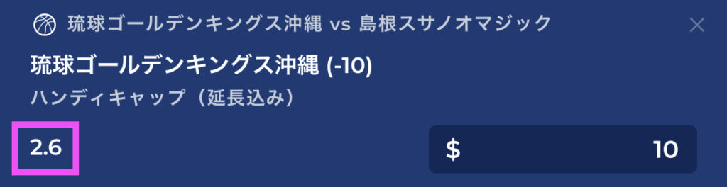 そのような場合に、琉球に10点分のハンデをつけることで、琉球は0-10の状態から試合を開始することになります。つまりハンデをつけたこの予想が的中になるには琉球が11点差以上で勝つ必要があるので、オッズも高くなります。