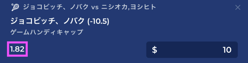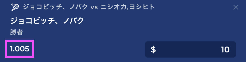 例えば、ジョコビッチvs西岡の試合結果を予想したいとき、「ジョコビッチが勝つな」と予想してもオッズはほとんどつきません。