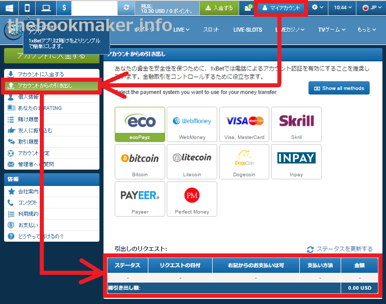 本文中にも記載しておりますが、引出前までに入金額と同額を1.1倍以上のオッズにベットしてください。