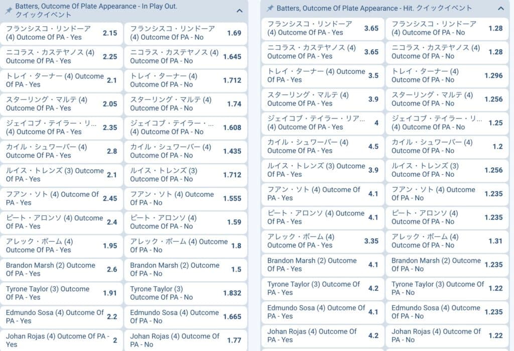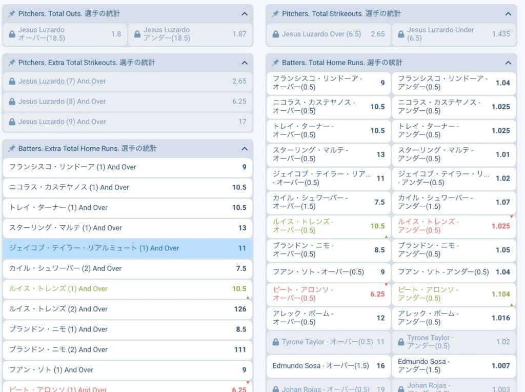 さらに、試合ごとに複数のマーケットが展開されており、単純な勝敗予想だけでなく「次の得点はどちらか」「5イニング終了時のリードチーム」など、マイクロな視点での戦略が取れるのも上級者には大きな魅力です。