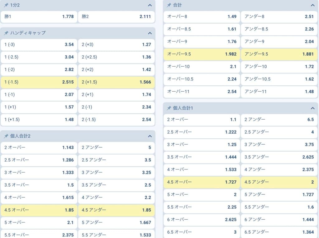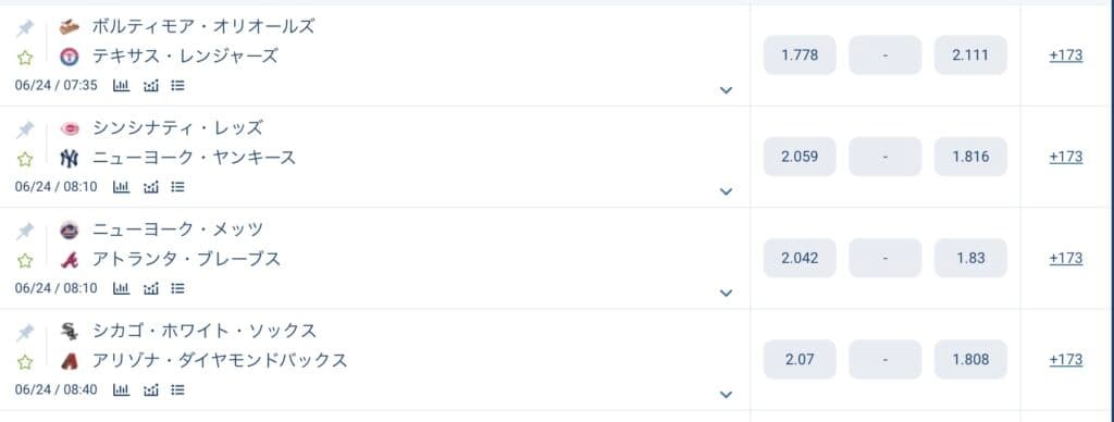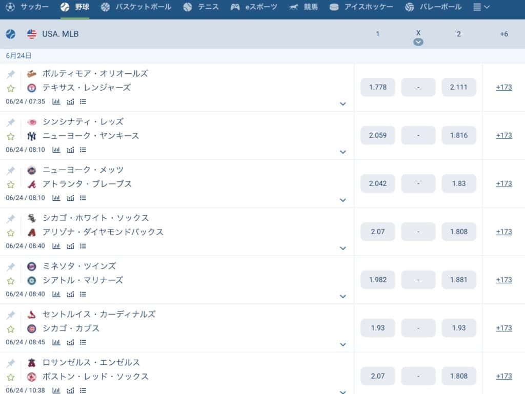 特にMLBやNPBの試合では、スタメン発表直後や先発投手の変更といった影響を受けたオッズが他社よりも早く反映される傾向があり、アドバンテージを取りやすくなっています。また、賭け対象の幅も広く、メインベットだけでなくイニング別やピッチャー勝敗予想といった細かい市場でも競争力のあるオッズが提供されている点も見逃せません。