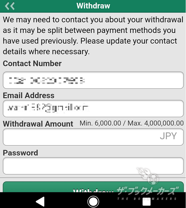 しかし、この方の場合は銀行情報の登録をしてほしいとの連絡が来たにもかかわらず、【Withdraw】ページが銀行情報入力画面に切り替わっていませんでした。