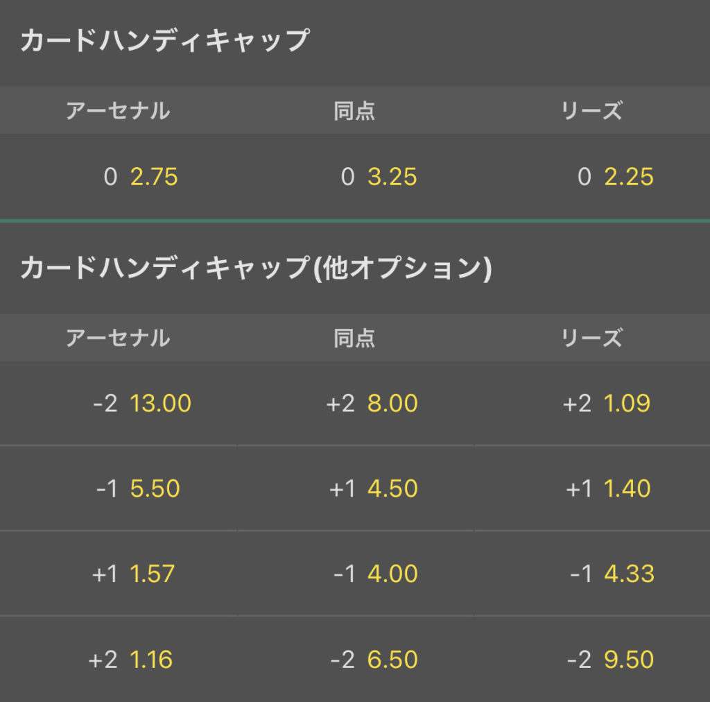 - カード数 アーセナル【2枚】 リーズ【3枚】の場合、リーズが-1で【2枚】となりますので、同点リーズ-1 @4.00にベットしていれば勝ちとなります。