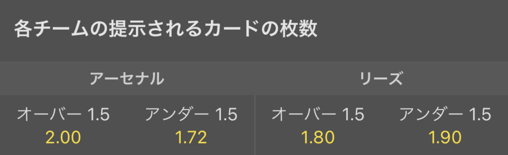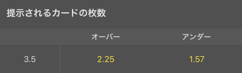 これは比較的シンプルな項目で、チームごとのカード数のオーバー/アンダーを予想するベット項目です。