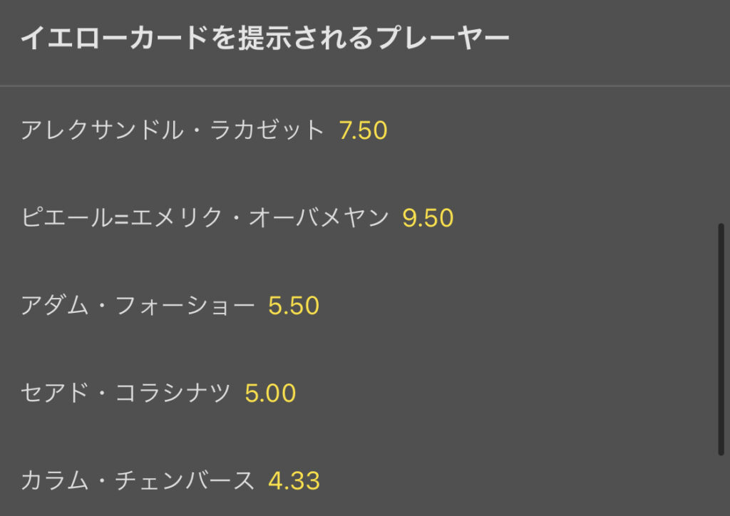 選手名が表示されてますので、「毎試合カードを受けている選手」であったり、「A選手とB選手は過去に因縁があって…」なんていうジンクスがあると、狙いたくなる項目ですね。