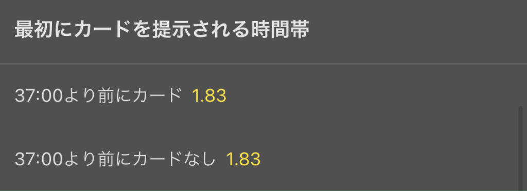 - 37:00より前にカードなし @1.83は試合開始後37分までにカードが出なければ勝ちとなります。