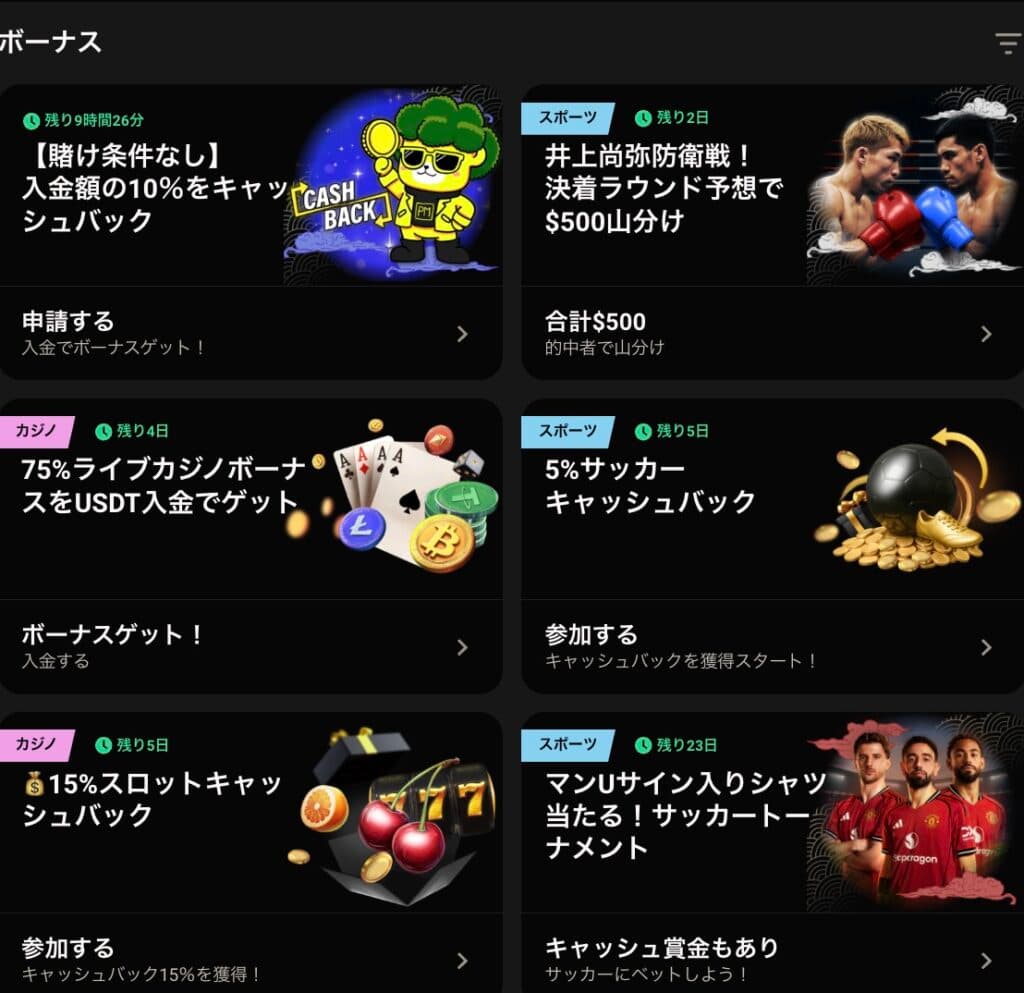 全体的に提供されているスポーツや賭けの種類などオッズが少なめの印象です。 - ボーナスやキャンペーンが少なめ