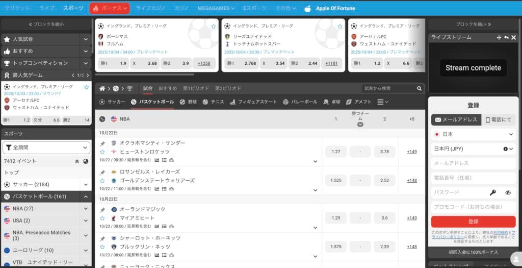 サイトではサッカー、野球、テニス、バスケットボールといった主要競技はもちろん、eスポーツや競馬、F1などニッチなスポーツまで網羅。特にラグビーやMMAなどのライブベット機能が充実しており、リアルタイムで動くオッズを楽しみながら戦略的に賭けを組み立てられるのが魅力です。