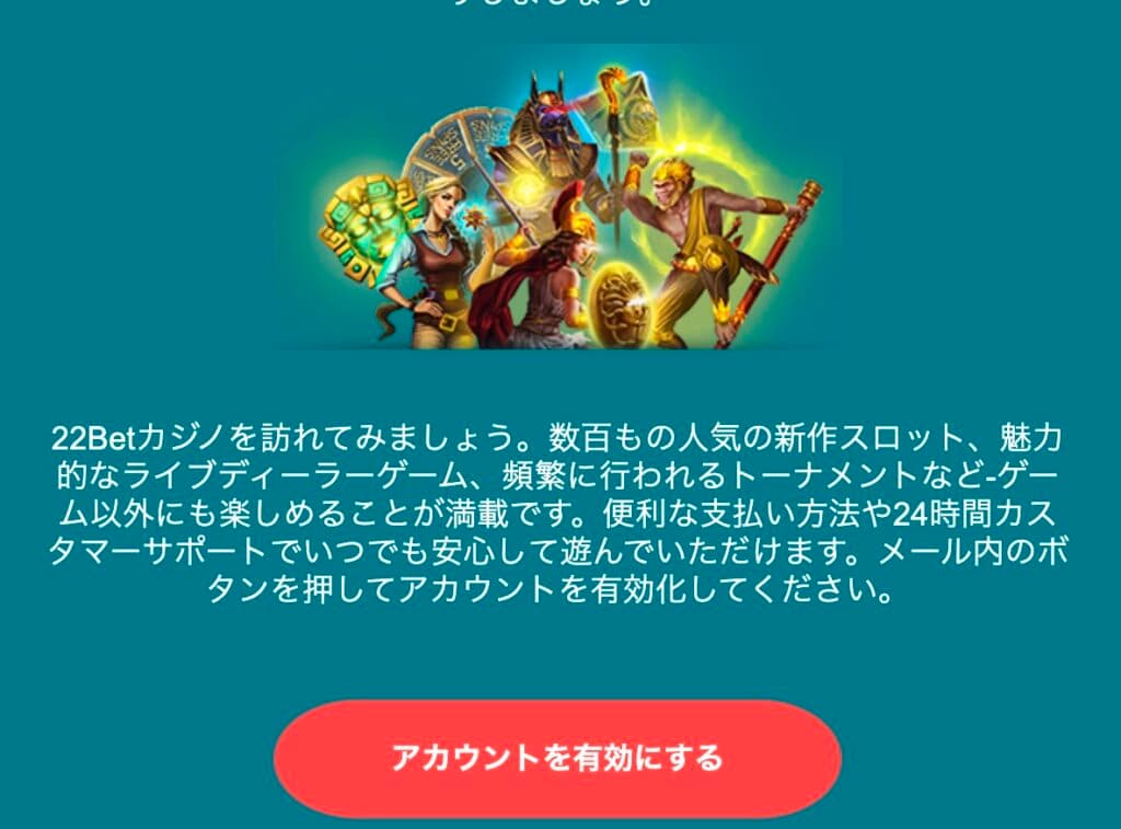 登録完了後はメールやSNSにアカウントを有効化させるメールが届きます。アカウントの有効化は72時間以内に行えば良いので、仮登録の段階でもアドレスと名前だけ入力して、すぐに利用が可能です!また、22betの公式アプリはiOS(iPhone)とAndroidの両方に対応しているので、外出先からもサクッとベットできます!