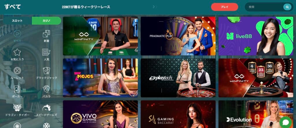 22bet(22ベット)のカジノ|ゲーム数・プロバイダー数が圧倒的な総合カジノ!