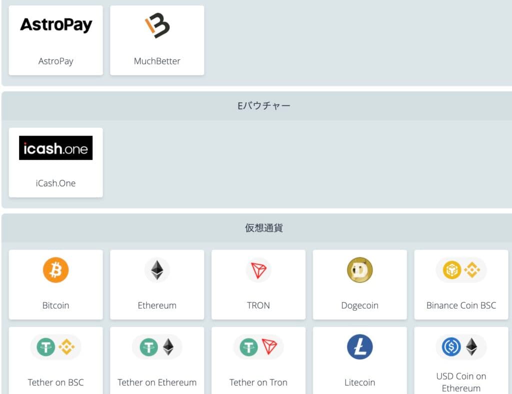 そのほか、MuchBetterやAstroPayといった人気のEウォレット、Binance Payにも対応しており、手数料やスピードの面でも満足できる仕組み。