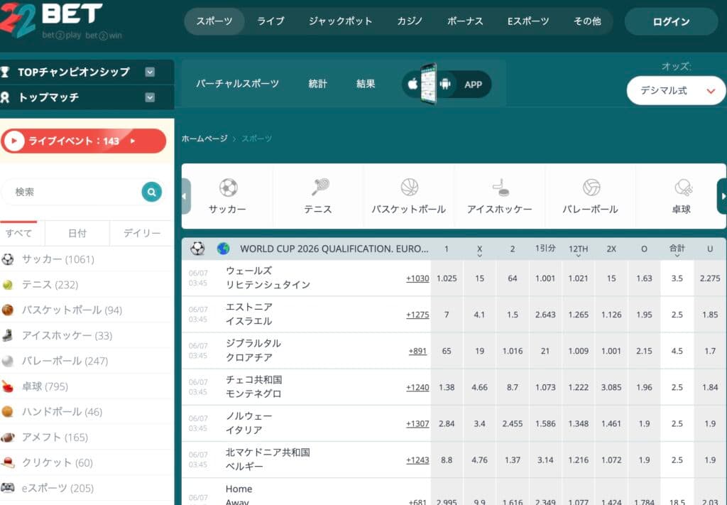 22bet(22ベット)は、世界最大級のブックメーカーである1XBETと同じプロバイダーを採用しているため、取り扱いスポーツ・マーケット数が非常に豊富です。