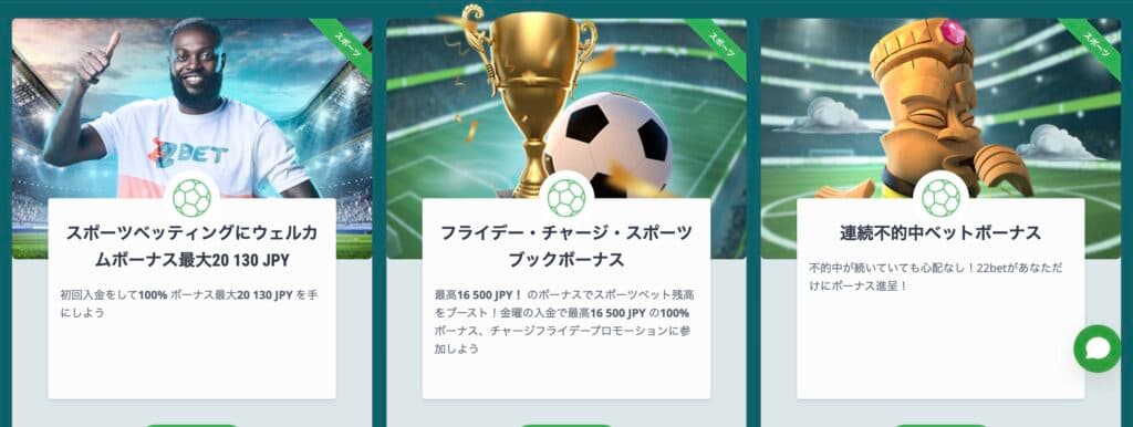 22BETでは、初回入金ボーナス以外にも、リピーター向けの魅力的なキャンペーンが随時開催されています。ここでは、特にスポーツベッティングに関連するプロモーションを中心に紹介します。