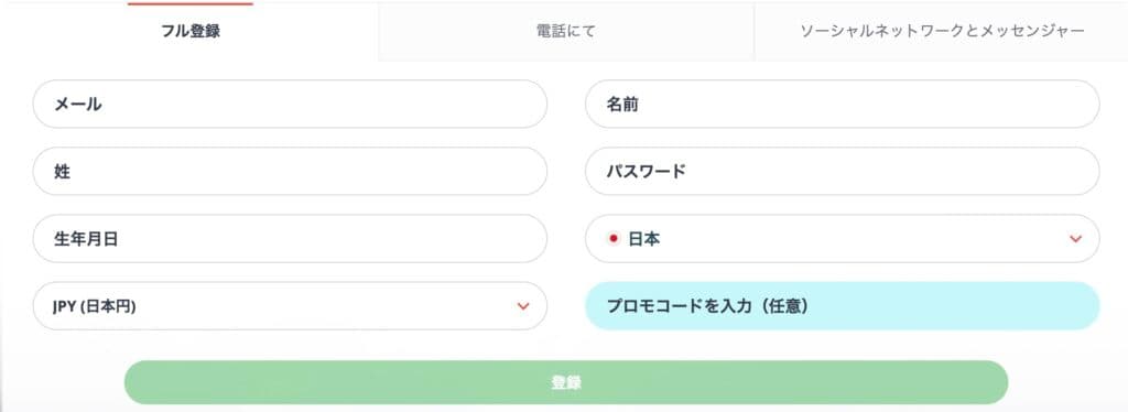最も一般的な方法がフル登録。メールアドレス、氏名、生年月日、国籍、通貨、パスワードを入力してアカウントを作成します。細かな情報を入力する手間はありますが、アカウントの紐付けや本人確認(KYC)の手続きがスムーズになるメリットがあります。