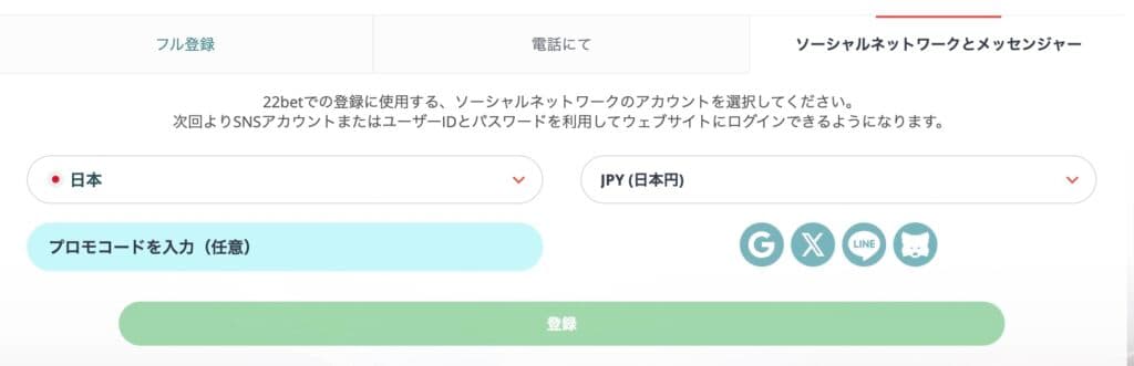 22betでは、GoogleやLINE、FacebookなどのSNSアカウントを使った登録方法も用意されています。フォーム入力が面倒な方にとって、もっとも手軽にアカウント作成できる方法といえるでしょう。