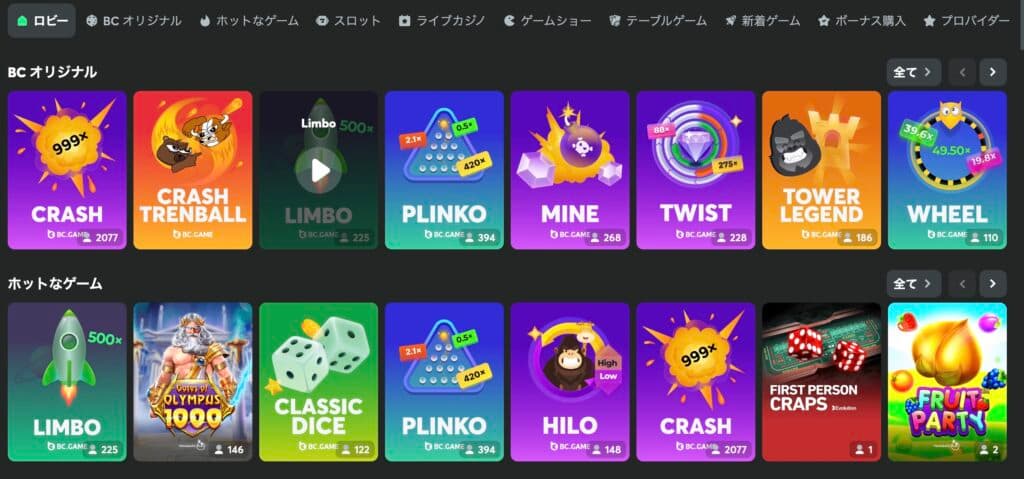 仮想通貨による即時プレイや、継続的に開催されるボーナスキャンペーン、さらにはコミュニティ主導のイベントなど、単なるオンラインカジノを超えた魅力が詰まっています。ここでは、BC.GAMEのカジノ機能の中でも特に注目すべきポイントを紹介します。