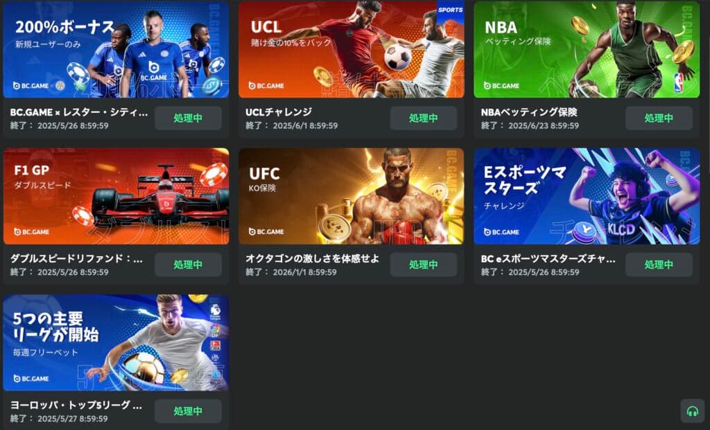 BC.GAMEでは、損失の一部が返ってくる「UCLチャレンジ」や「NBAベッティング保険」、初回入金時の「200%ボーナス」、KO対策の「UFC保険」など、多様なプロモーションが用意されています。