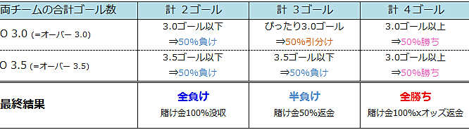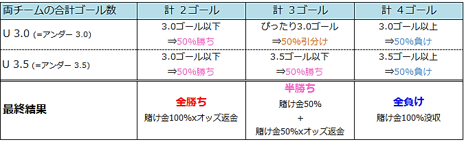 Line (=Goal Line)とは両チームの合計ゴール数を予想するものです 『O』はOver(=オーバー)の略、『U』はUnder(=アンダー)の略になります 今回のように『3.0,3.5』など2つの数字がある場合は賭け金の半額をそれぞれの数字に賭けます