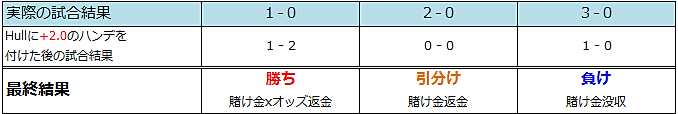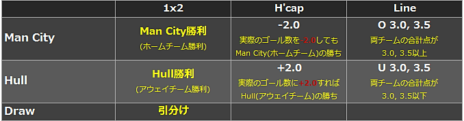 H’cap (=Asian Handicap)とは、実際の得点にハンデした場合の勝者を予想するものです