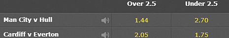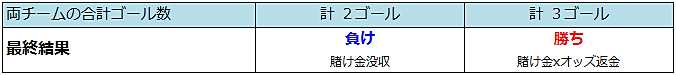 (=Goal Line)とは両チームの合計ゴール数を予想するものです この賭けのルールは ② Goal Lineと同じです。違いは基準の数字のみです。 (先ほどのGoal Lineの基準の数字は『3.0,3.5』こちらの Goals Over/Underの基準の数字は『2.5』)
