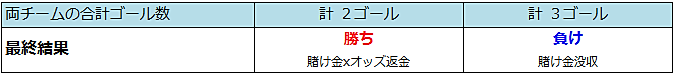 一番基本の賭け方となるもので試合の結果(勝ち、負け、引分け)を予想します 引分けでも賭け金は返還されません