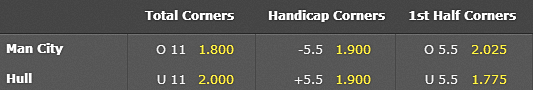 マンCのコーナー数がハルシティのコーナー数より5.5回以上多いと思えば -5.5 1.90 マンCのコーナー数とハルシティのコーナー数の差は5.5回以下だと思えば +5.5 1.90 に賭けて下さい