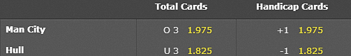 マンCがハルシティより1枚以上多くカードを受け取ると思えば +1 1.975 マンCとハルシティの受け取るカードの差は1枚以下だと思えば -1 1.825 に賭けて下さい 両チームのカード差が1枚ちょうどだった場合は賭け金は全額返金されます。