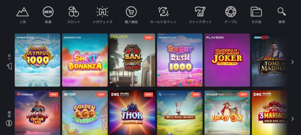 信頼性の高いゲームプロバイダと提携し、演出・操作性・ボーナス機能の質も高水準を保っています。さらに検索性やジャックポットなど、「遊びやすさ」と「勝ちやすさ」に配慮した設計も人気の理由です。