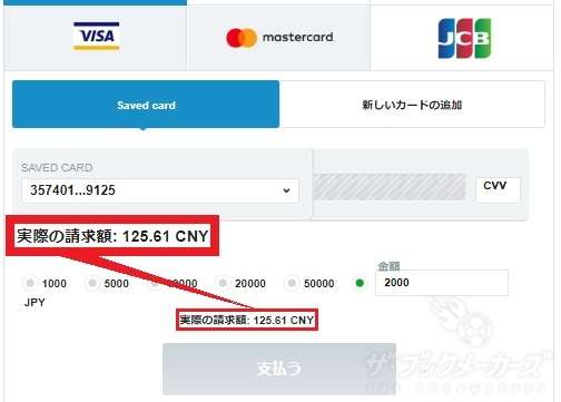 JCB・マスターカードは中国元(CNY)にそれぞれ両替されて入金されるようです。