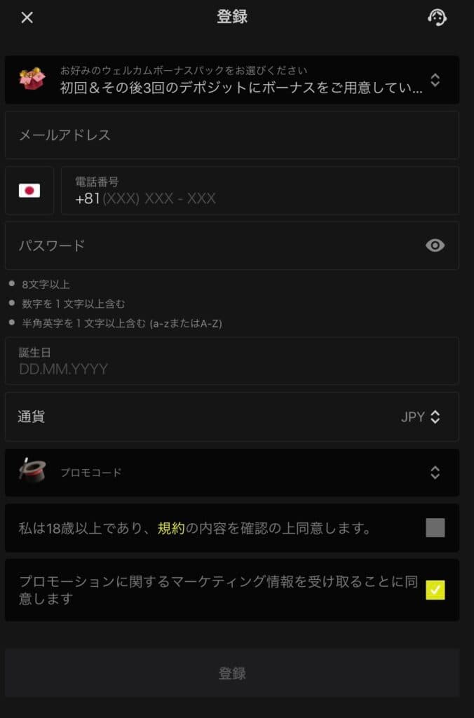 登録フォームではまず連絡先(メールか電話)を入力し、条件を満たすパスワードを作成。次に誕生日を入力し、利用する通貨を選べば準備は完了です。プロモコードがあればここで入力しておくと、ボーナスや特典を受けられるチャンスも広がります。