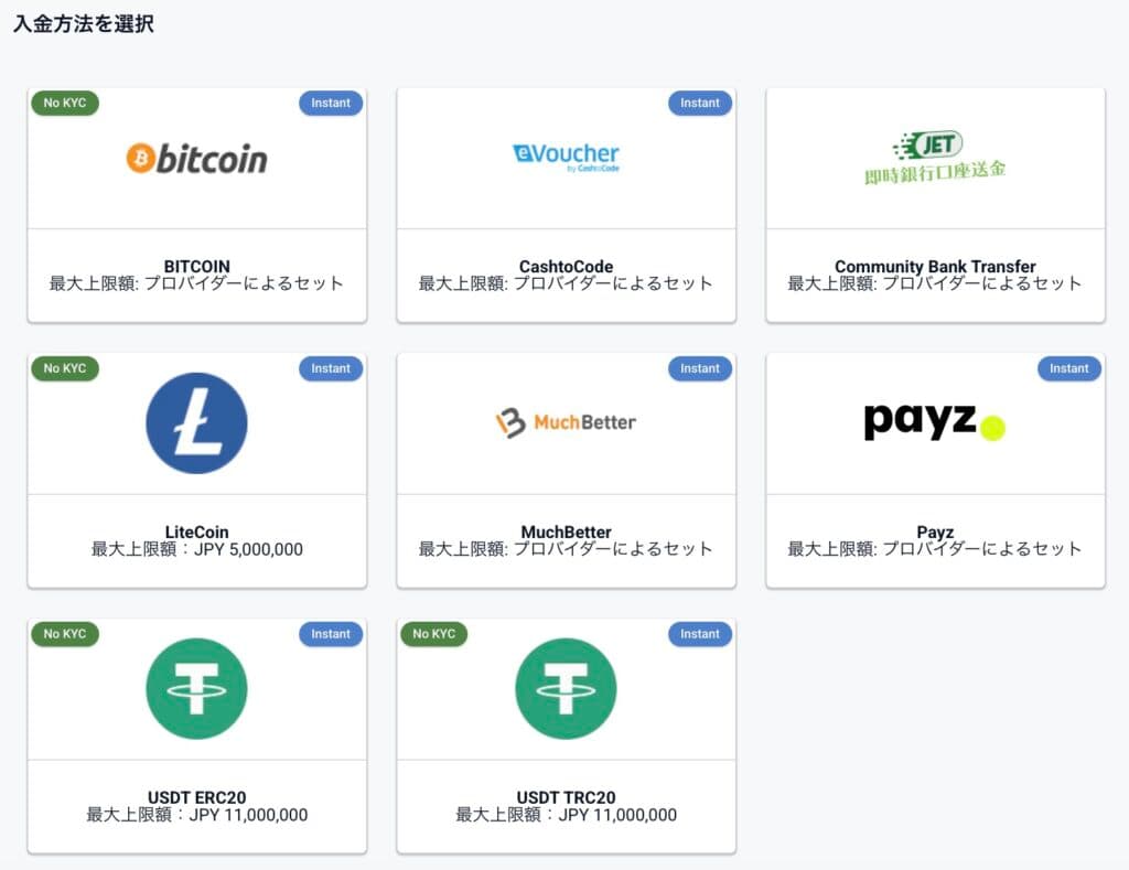 | 入金方法 | クレジットカード(JCB・Master)、銀行送金、 payz、eVoucher、Bitcoin、Litecoin、USDT(TRC20/ERC20) |