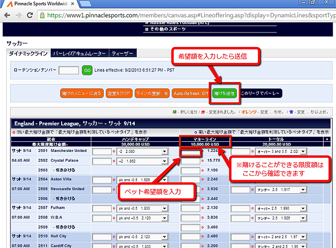 それぞれのゲームの左側の空欄に金額を入力し 賭けを送信 ボタンをクリックして下さい