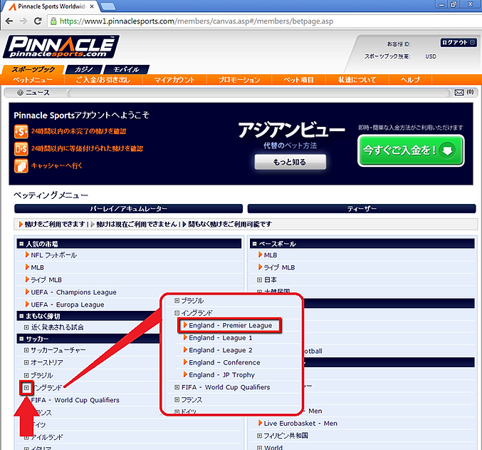 賭けたい試合の行われる国を選んでクリックして下さい