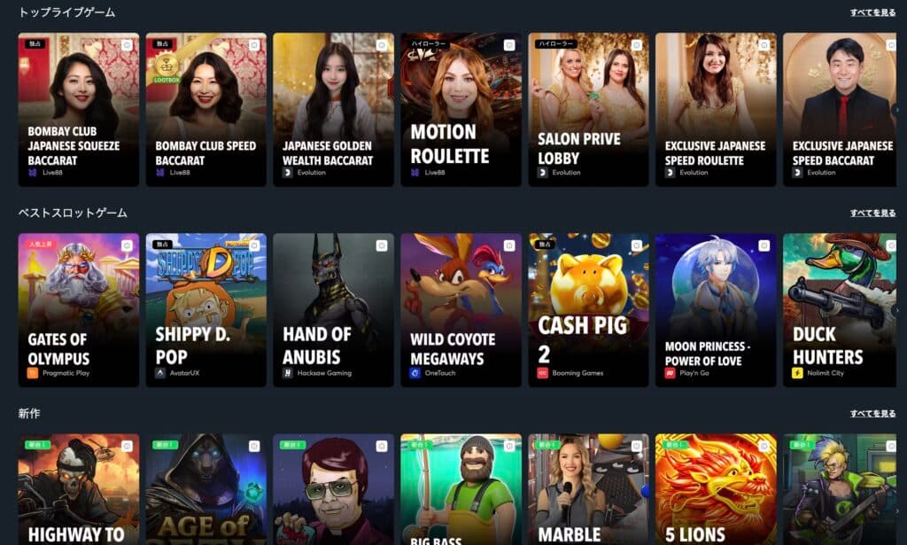 ライブカジノでは、Evolution GamingやBombay Liveなどのトッププロバイダーによる高品質なゲームが提供されています。バカラ、ブラックジャック、ルーレットなどの定番ゲームに加え、「Crazy Time」や「Sweet Bonanza Candyland」などのゲームショーも楽しめます。