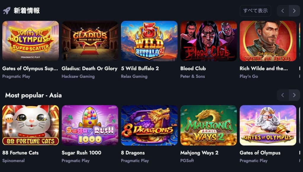 定番のブック・オブ・デッドやスイートボナンザに加え、ジャックポット機能付きスロットや高ボラティリティ機種も網羅。フィルター検索や人気順表示も快適で、初めてのプレイヤーでも好みのスロットをすぐに見つけやすい仕様になっています。