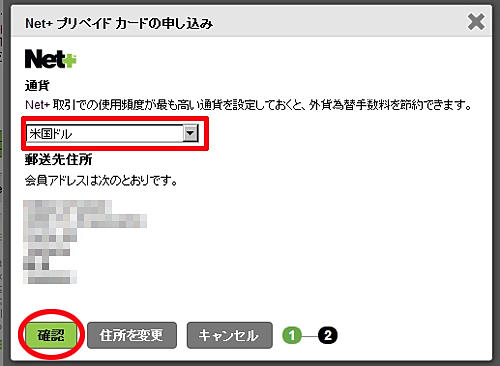 通貨を選択、カードの送付先が合っていれば 確認 をクリック