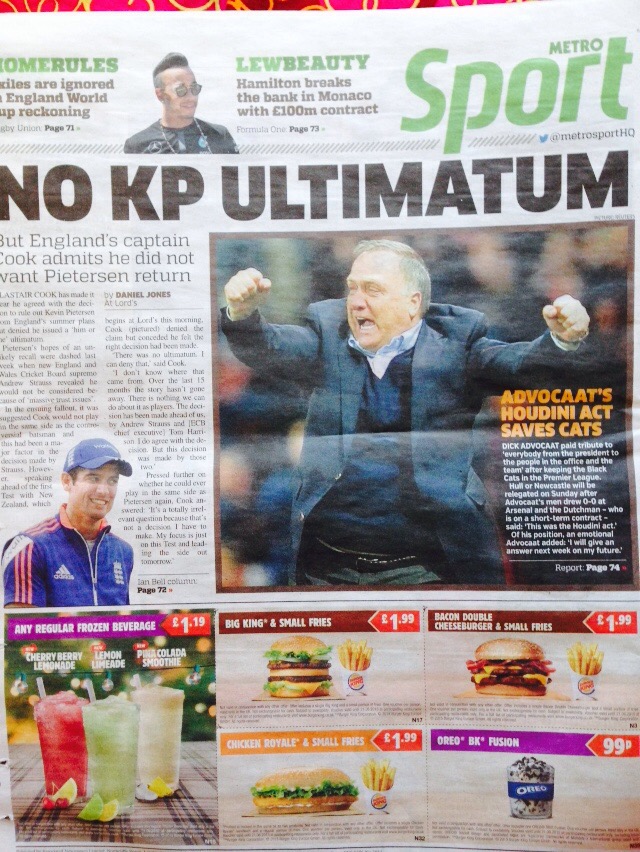 今日もロンドンからおはようございます✩ 妹です! 今日のスポーツの一面はクリケット選手の話題と、リトル・ジェネラルという愛称でおなじみのDICK ADVOCAAT監督のガッツポーズです! DICK ADVOCA...
