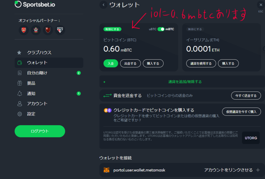 さて、スポーツベットIOに0.6mBTC残高があり、それを日本円に変えたいとします。