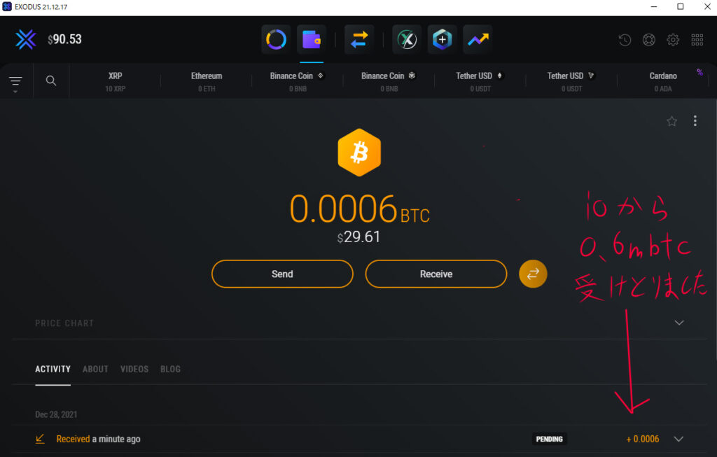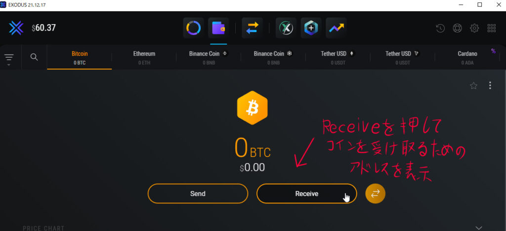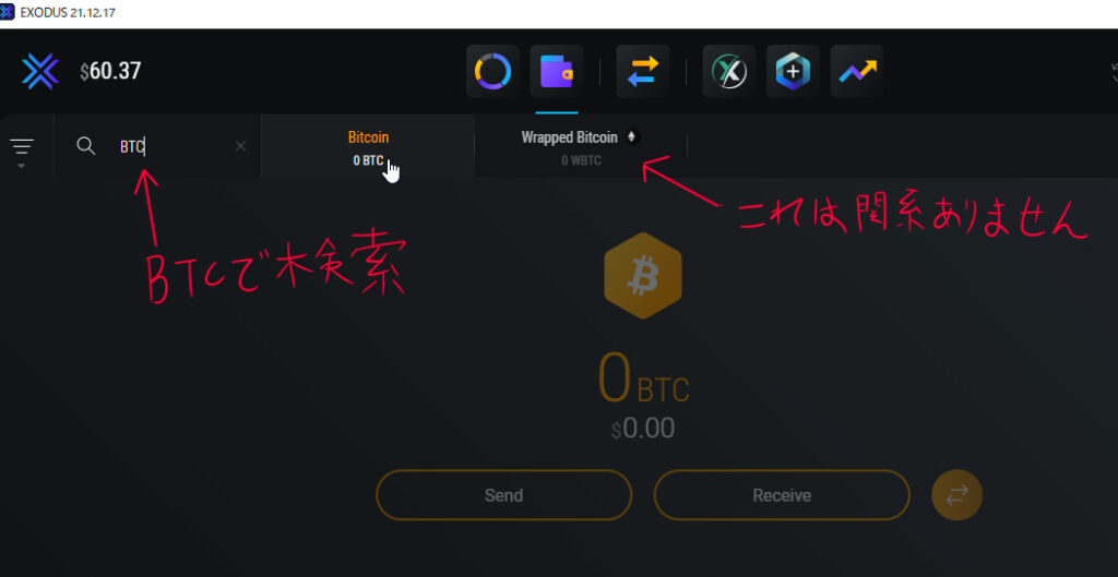 - EXODUSの画面でBTCを選択