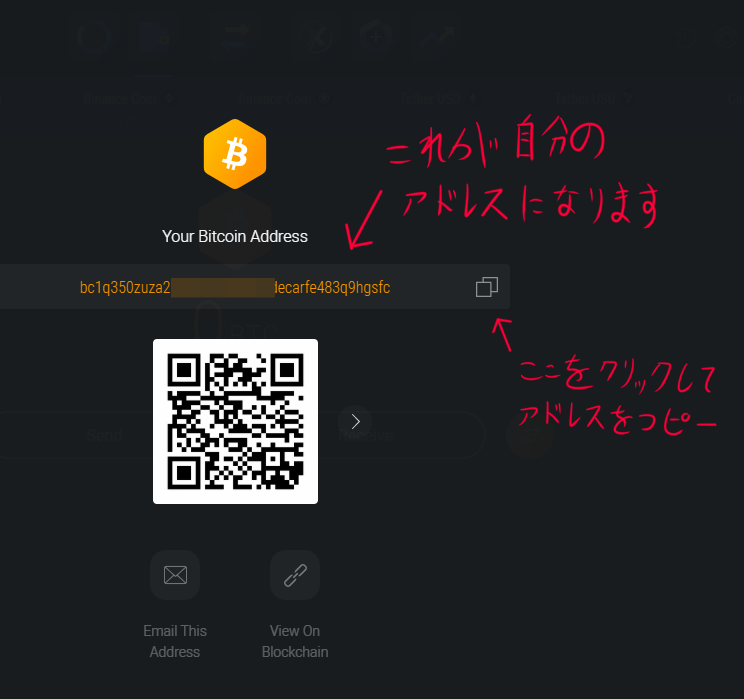 Receiveを押すと自分のアドレスが表示されるので、右側の四角形をクリックしてそれをコピーします。