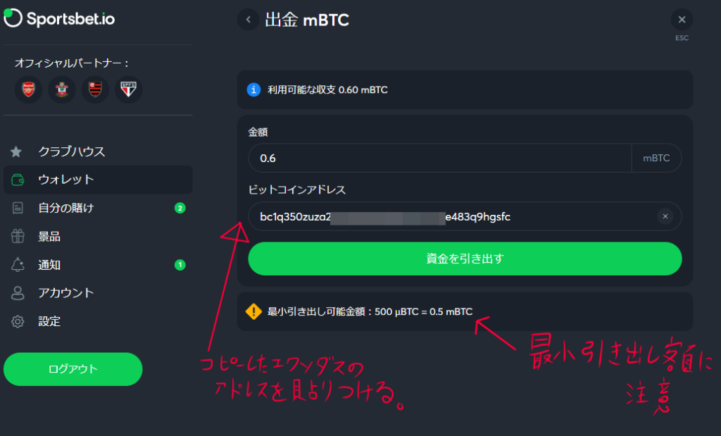 そうしたら先ほどのアドレスを貼り付けて、ブックメーカーから出金申請をします。