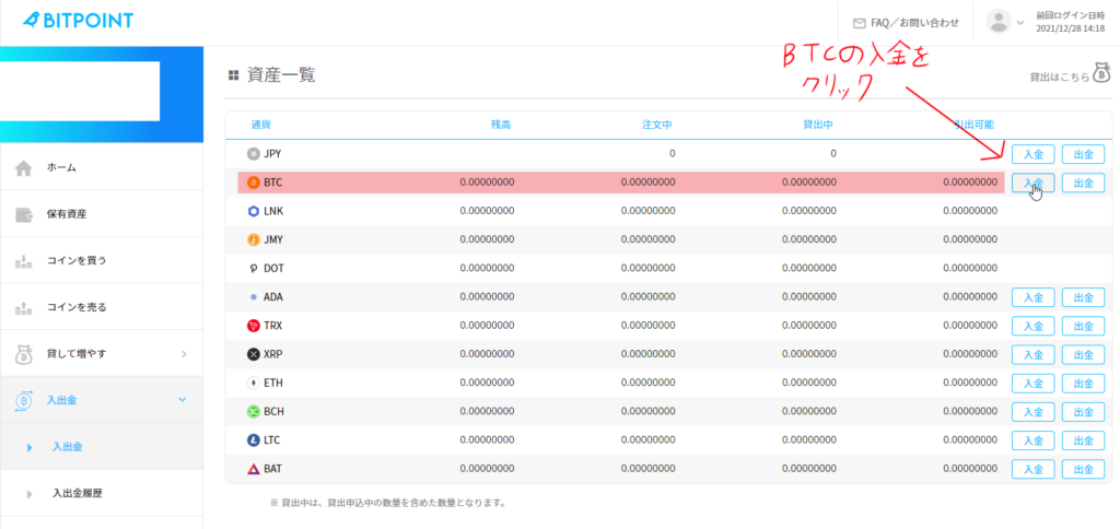 取引所へ送る際もやる事は同じです、まずは取引所のBTC入金をクリック。