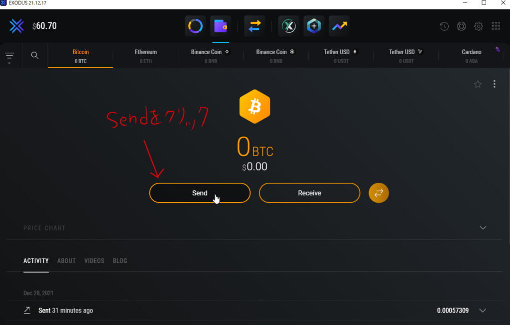 アドレスをコピーしたらEXODUSのSEND(送金)をクリックし、送金したい金額を入力します。