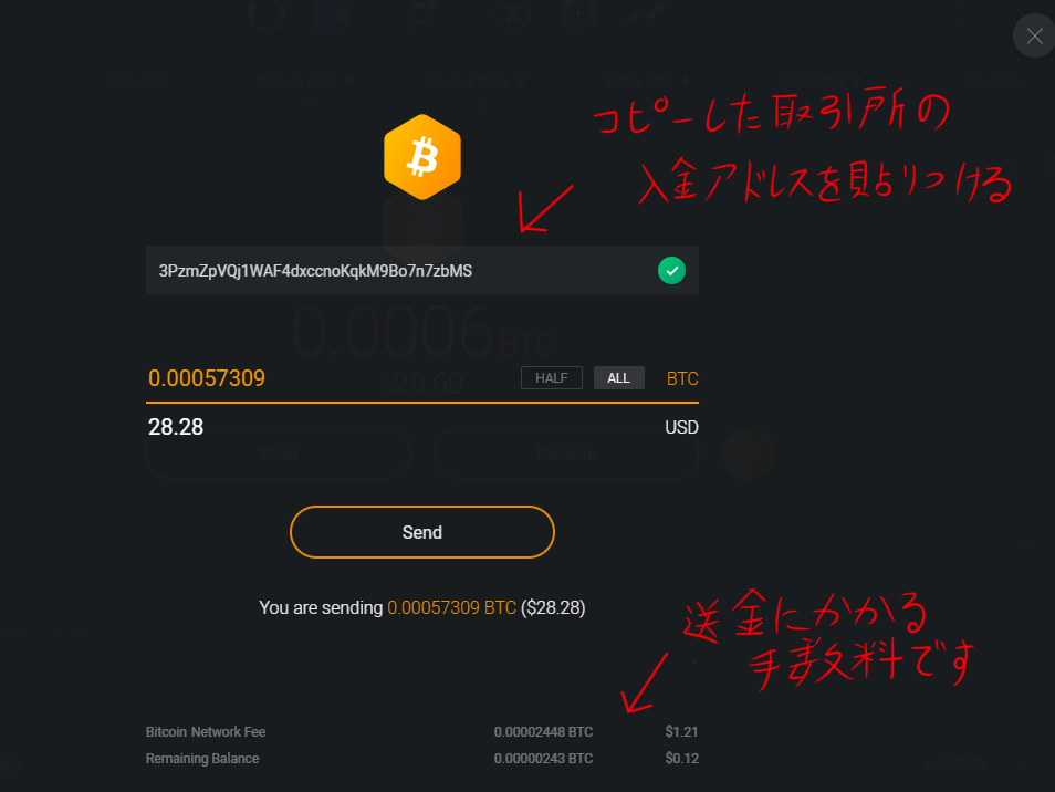 - 送金するBTC金額・アドレスをコピーします