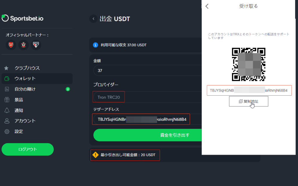 まず、国内の取引所からトロンを購入し、スポーツベットIOからUSDTを出金したのと同じように