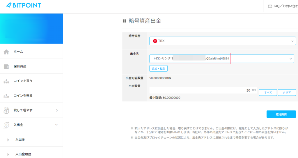 アドレスとネットワークを確認して出金申請