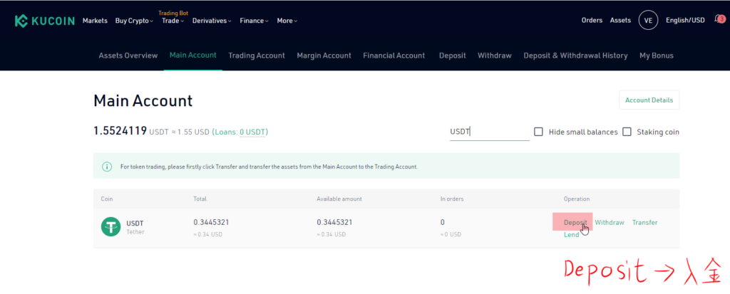 USDTのDepositでUSDTを入金します。
