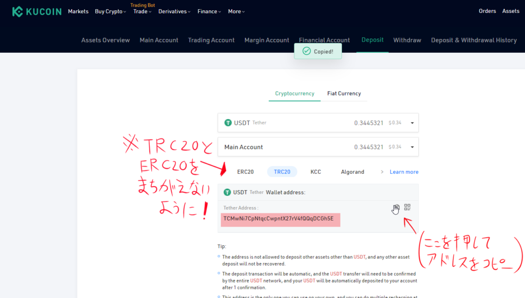 ※間違うとUSDTが紛失するので絶対に間違えないように