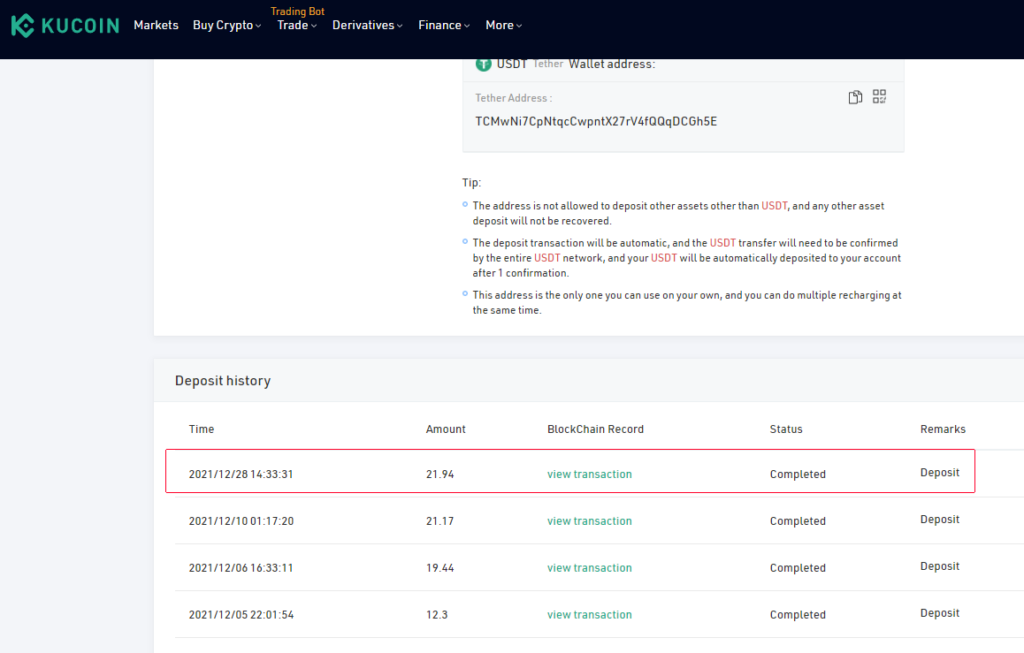 TRC20は送金が早いので数分で反映されると思います。