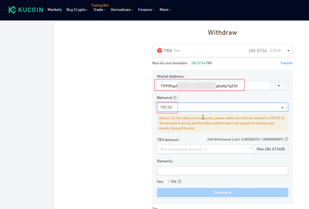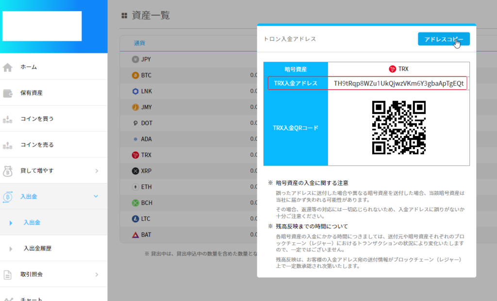 あとはIOからUSDTを送ったのと同じ要領で、トロンリンクウォレットから、トロンを国内の取引所に送ります。